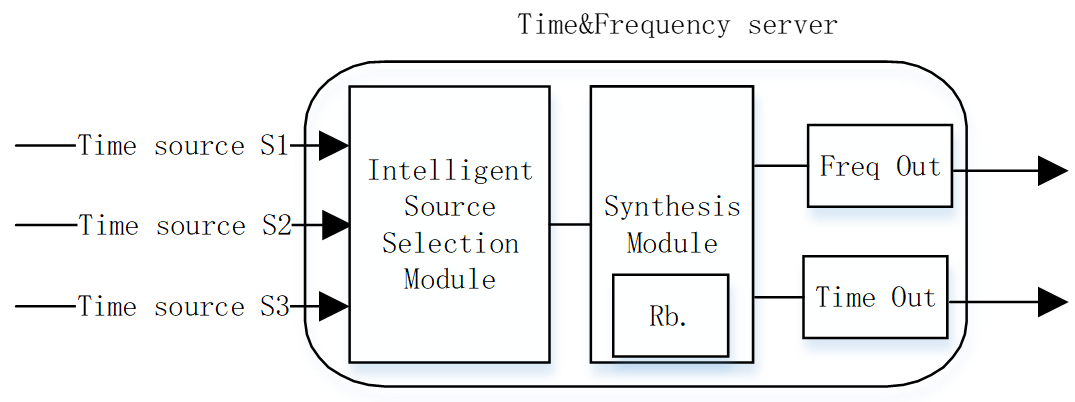 After S1, S2, and S3 time sources connected, they is an intelligent source selection module calculate the comprehensive priority, the time source with low failure rate, high accuracy, and high stability is finally selected for use by the synthesis module. This patent technology statistically utilizes the annual average available time, avoiding the frequent switching problems that may arise from the current preset priority-based source selection method, thereby improving system availability and stability. For fiber optic time synchronization systems requiring large-scale networking across the country, this technology can serve as a basic algorithm to form an nationwide intelligent timing network.