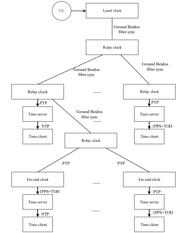 Commonly used network time synchronization technologies include NTP, PTP, 1PPS+TOD, and Taifu’s patented technology – Ground Beidou Time Synchronization, among others. Among them, NTP is mainly used for millisecond-level precision time synchronization in public networks or local area networks; PTP is mainly used for nanosecond-level precision time synchronization within dedicated networks; 1PPS+TOD is mainly used for nanosecond-level precision time synchronization over short distances (within 100 meters) in dedicated rooms; and Taifu’s patented technology – Ground Beidou Time Synchronization is mainly used for picosecond-level precision time synchronization over long distances in dedicated networks. A complete time synchronization network is typically a multi-node, long-distance time synchronization system composed of the above several time synchronization technologies, as shown in the following figure:
